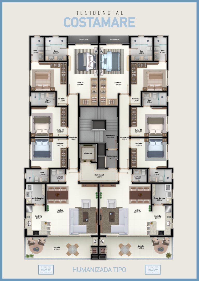 Amplos apartamentos com fino acabamento, 04 suítes e 03 vagas de garagem.